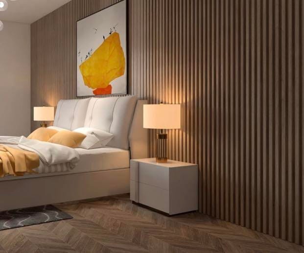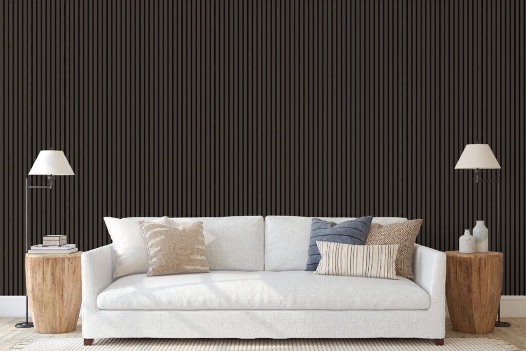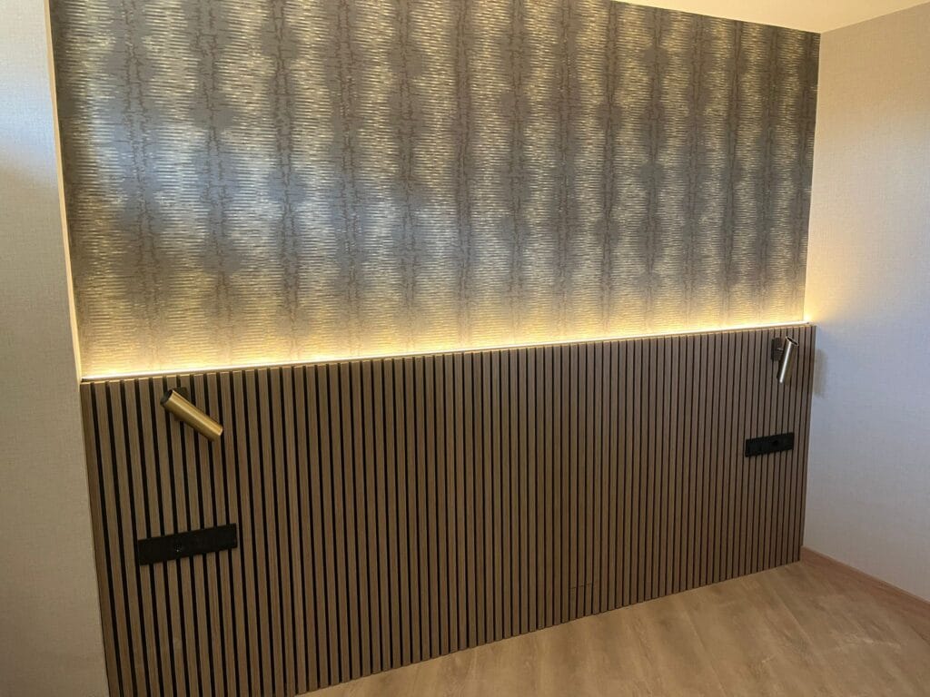 Para quienes buscan un acabado más sofisticado, ponemos a tu disposición revestimientos alistonados de PVC con un diseño actual y gran atractivo visual. Además, ofrecemos paneles acústicos con base fonoabsorbente e ignífuga, perfectos para mejorar el confort acústico, y listones de madera chapada con barniz mate en medidas de 2700 x 325 x 21 mm, que aportan calidez y elegancia.
